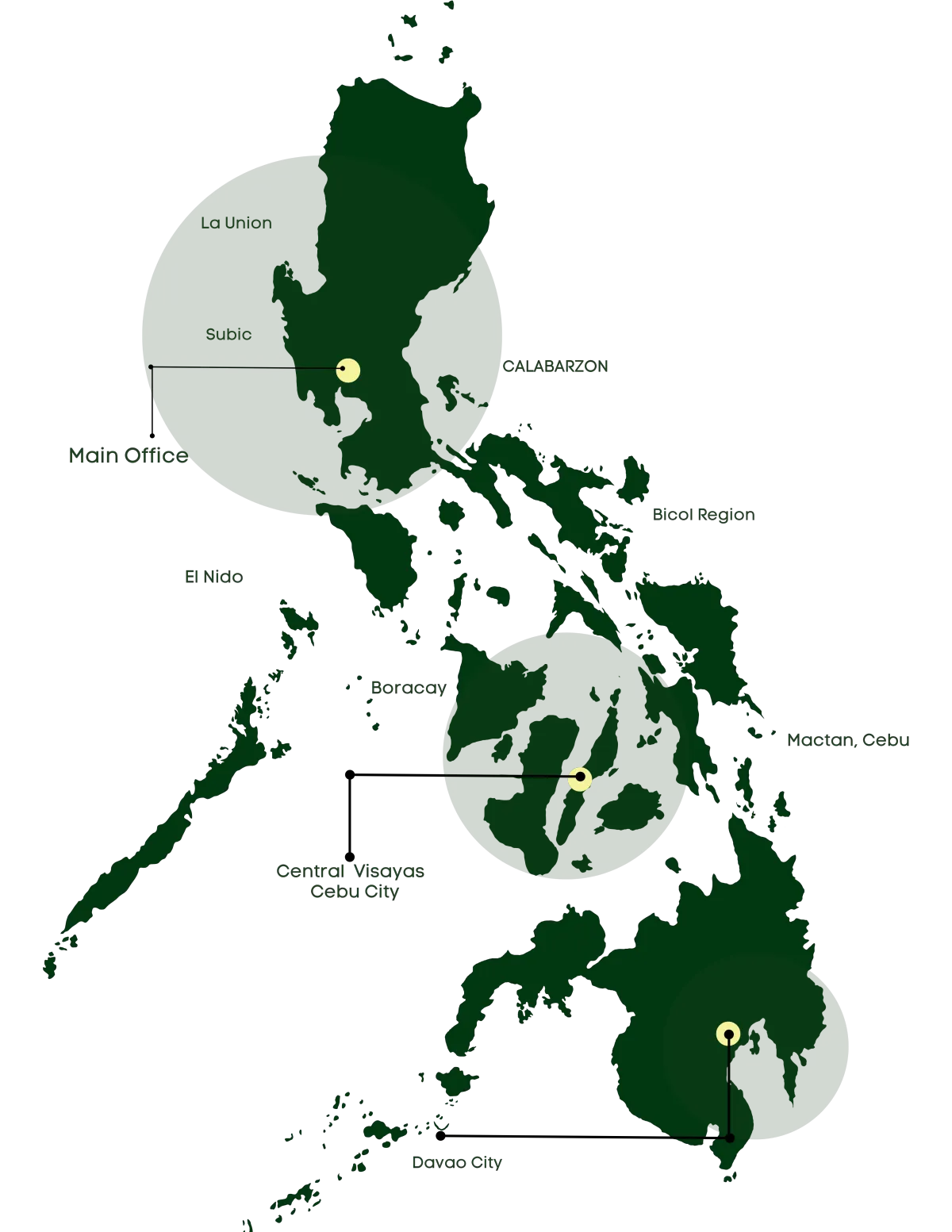 Batangas • Cavite • Laguna • Rizal • La Union • Bataan • Zambales • Boracay • Subic • Clark • Davao City • Samal • Bohol • Cebu • El Nido • Baguio